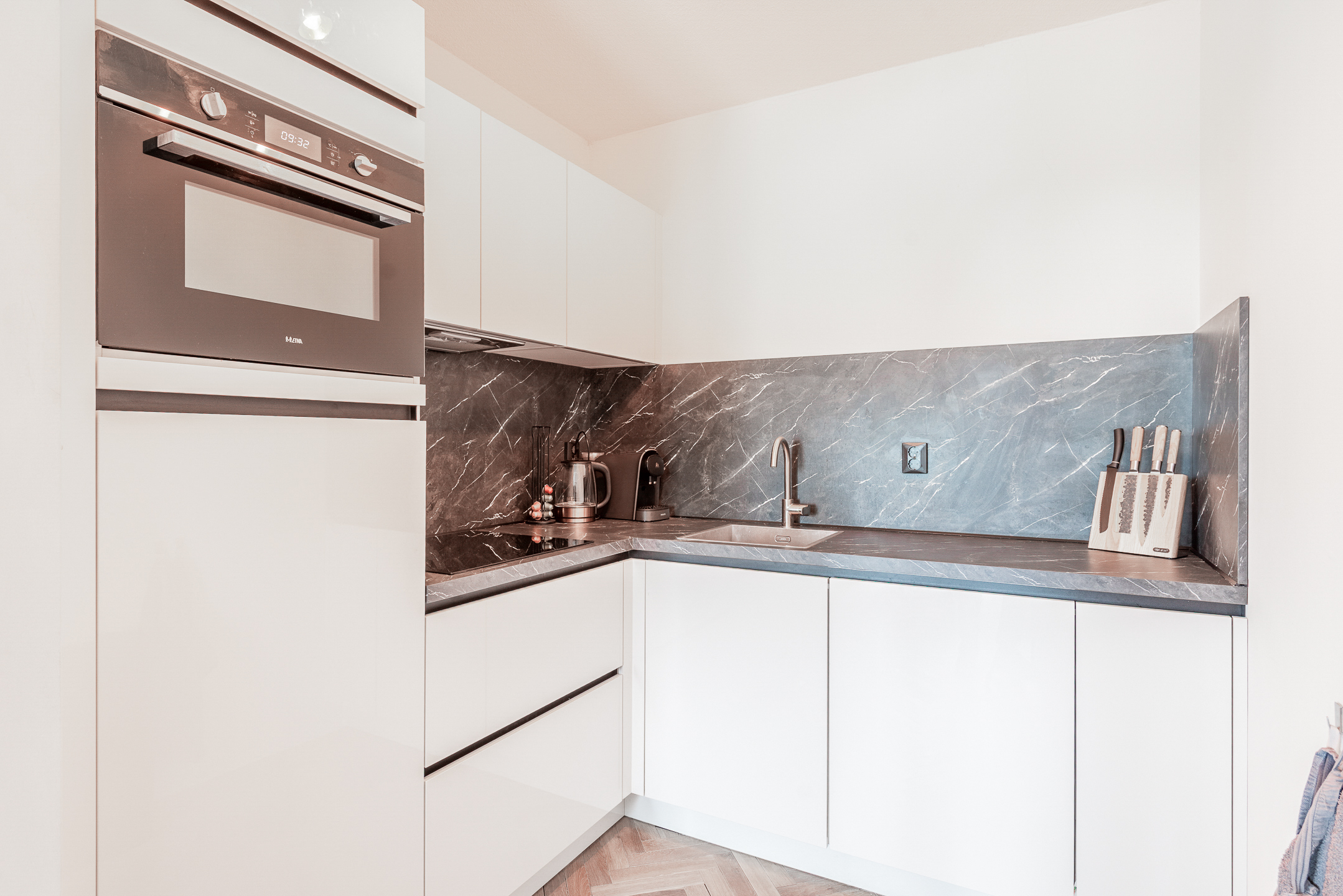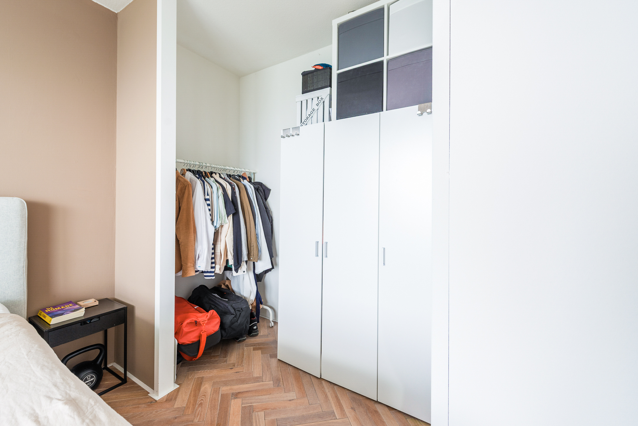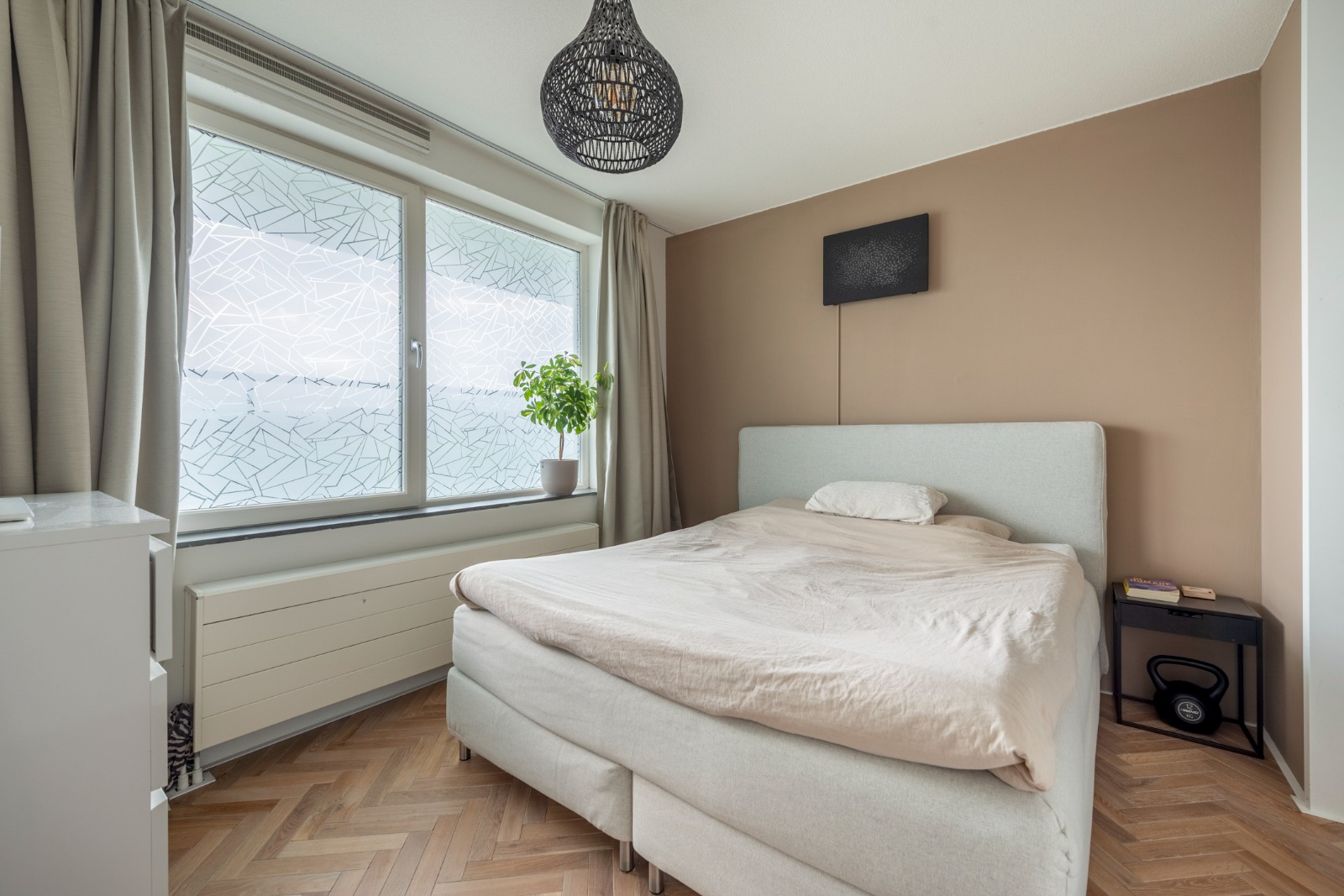 Zodra je de deur van nummer 106 binnenstapt, valt vooral het afwerkingsniveau en de rustige uitstraling op. Het appartement is in 2023 gemoderniseerd waarbij is gekozen voor een warme maar ook strakke stijl. Zo is de gehele woning (behalve de badkamer) voorzien van een fraaie in visgraatmotief gelegde houten lamelparketvloer.